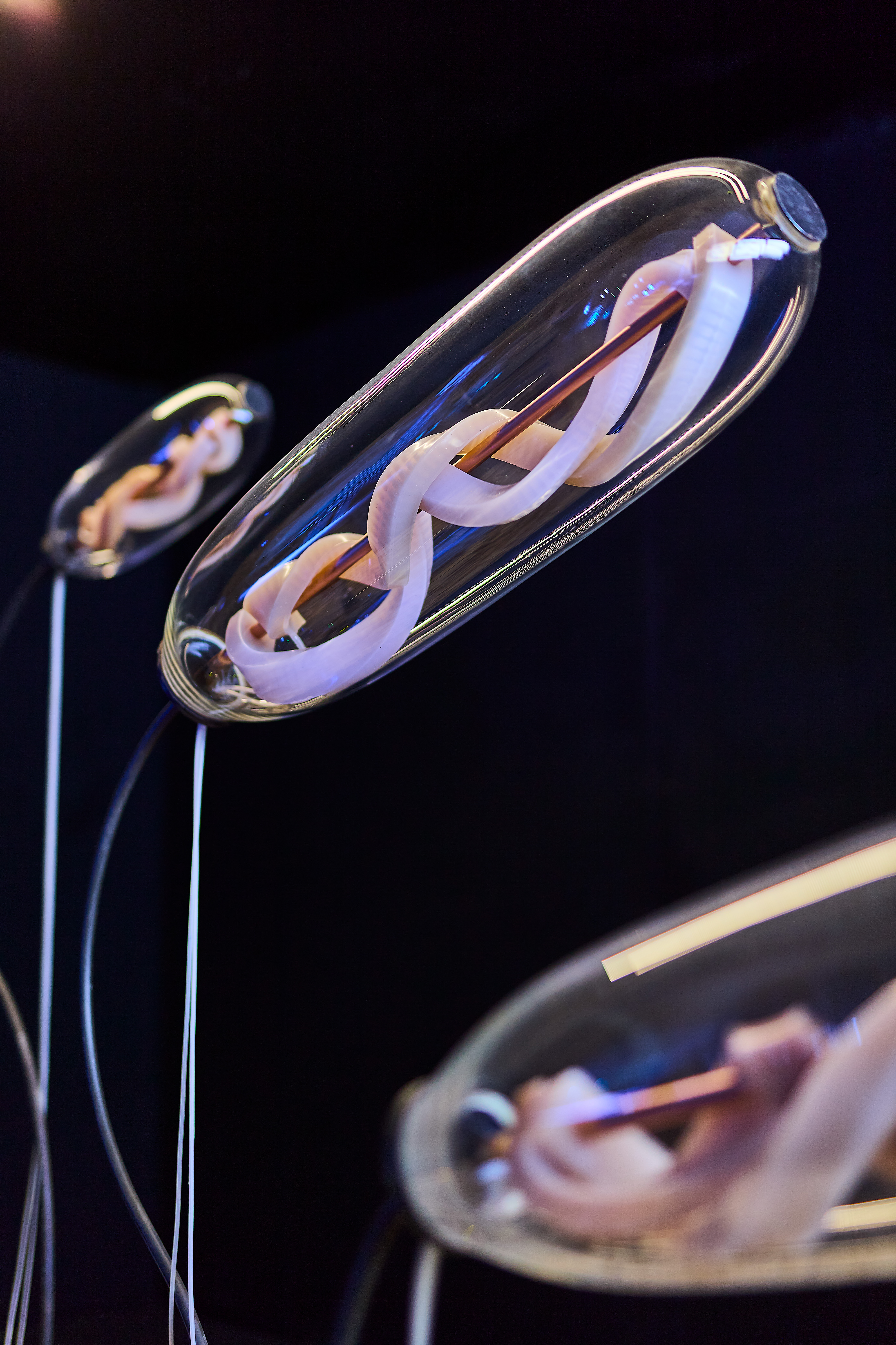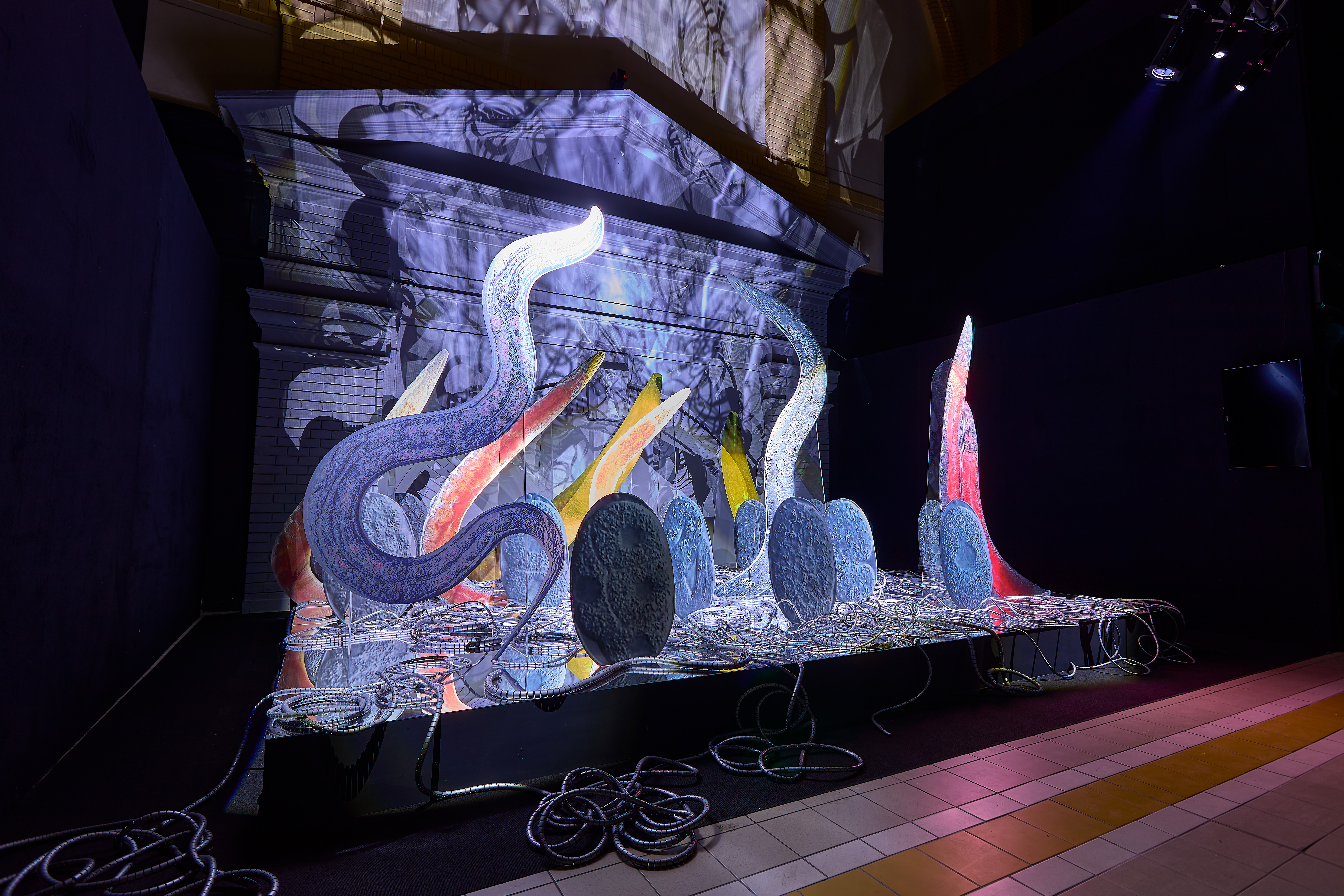 Nagyobb evolúciós ugrások megfigyelése, valódi együttélési minták keresése, és az élő organizmusok alkalmazkodási stratégiáinak megértése mellett a kiállítás olyan új szimbiotikus kapcsolatokat is vizsgál, amelyek túllépnek a biológia konvencionális határain, és magukban foglalják a mesterséges intelligenciát és a gépi entitásokat is. A szintetikus biológiának, a neurotechnológiának, a biotechnológiai kutatásoknak vagy a soft robotikának köszönhetően az élet megkonstruálható technológiává vált. Akár összetett biotechnológiai újításokra, akár olyan hétköznapi dolgokra gondolunk, mint a digitális világban szerzett tapasztalatok vagy a monitor képernyőjének kék fénye, a technológia átfogó hatással van testünkre, egészségünkre, viselkedésünkre, érzelmeinkre, és arra, hogy milyen módon lépünk interakcióba a környezetünkkel. Ahogy az AI egyre kifinomultabbá válik, természetes módon merülnek fel kérdések a technológiai rendszerek működéséből fakadó tudatosság és cselekvőképesség formáiról és tartalmáról. A kiállítás több műve is hibrid együttműködéseket képzel el emberek, más élőlények és mesterséges entitások között, ami arra utal, hogy a bolygón való együttélés jövője megkövetelheti tőlünk, hogy bővítsük az „élet” fogalmának definícióját. Ezek a spekulatív szimbiózisok elgondolkodtathatnak bennünket arról, hogy lehetséges, hogy elérkezett az idő olyan etikai keretrendszerek kidolgozására, amelyek képesek elfogadni az intelligencia és cselekvőképesség korábban nem létező formáit, teret engedve a fajok és entitások közötti együttműködés mostanáig elképzelhetetlennek tűnő formáinak.