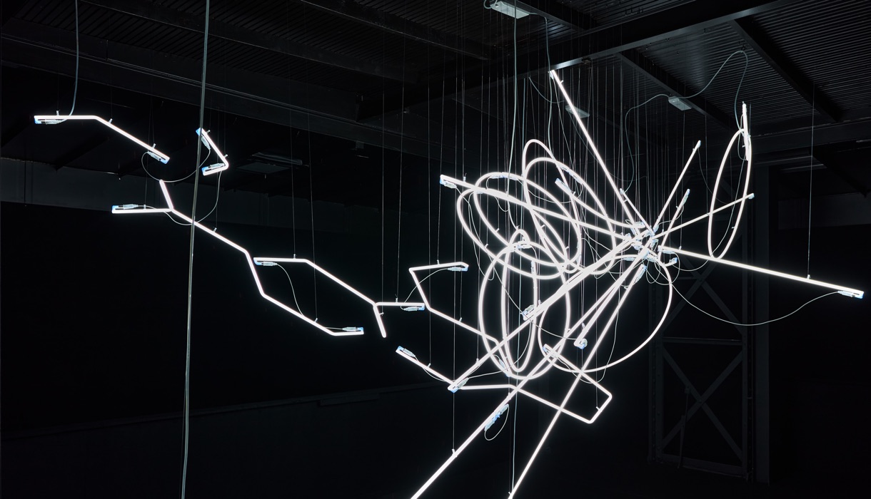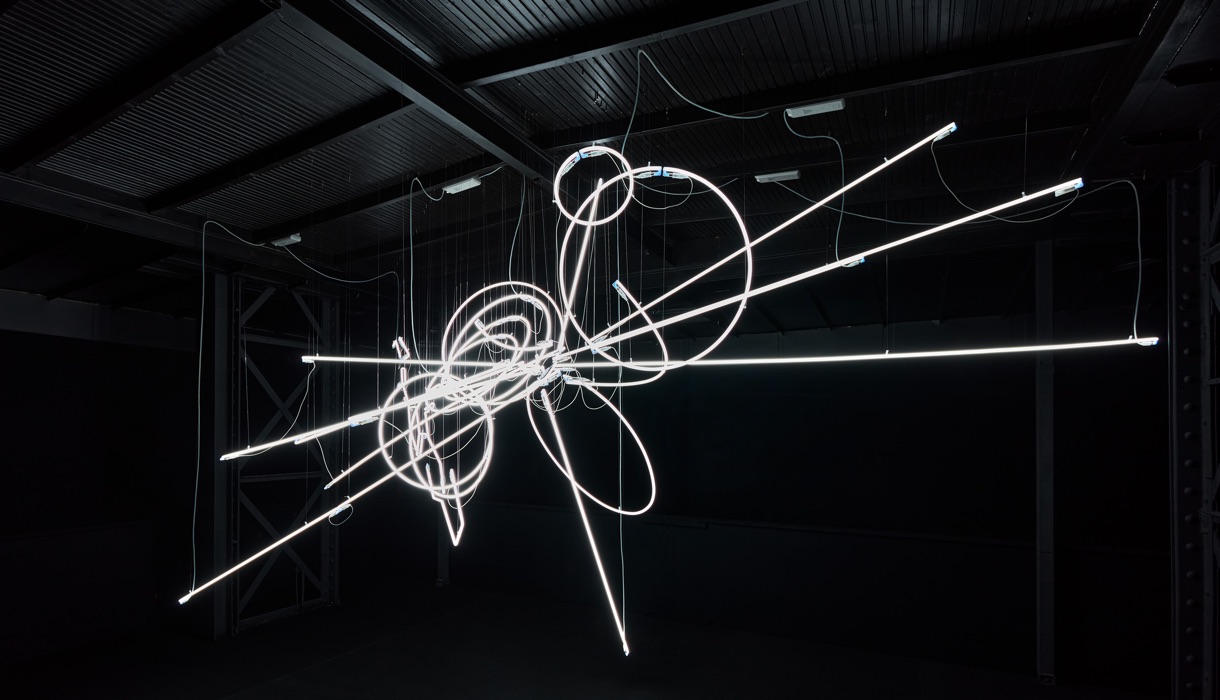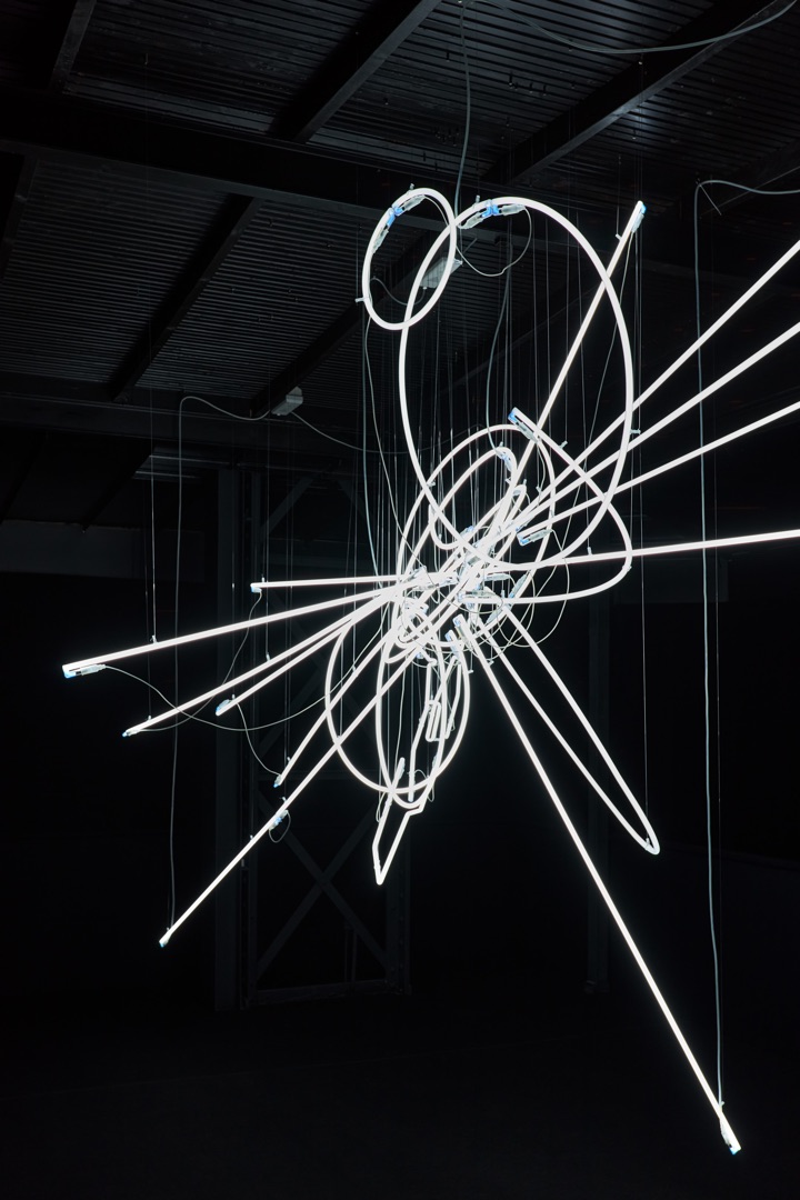Cerith Wyn Evans munkássága megfoghatatlan, (tudományos bizonyításukig) csak hipotézisként létező fogalmak, paradigmaváltó elméletek láthatóságának és valós jelentőségének feltárására irányul. Itt látható neonművében az LSD kémiai szerkezetének enyhén torzított formája a nagy energiájú részecskesugarak pályájának ábrázolása fölé kerül, mintha a valóság két ontológiai formája ütközne össze. Ez a találkozás pedig új nézőpontokra és új világok születésére ad lehetőséget.