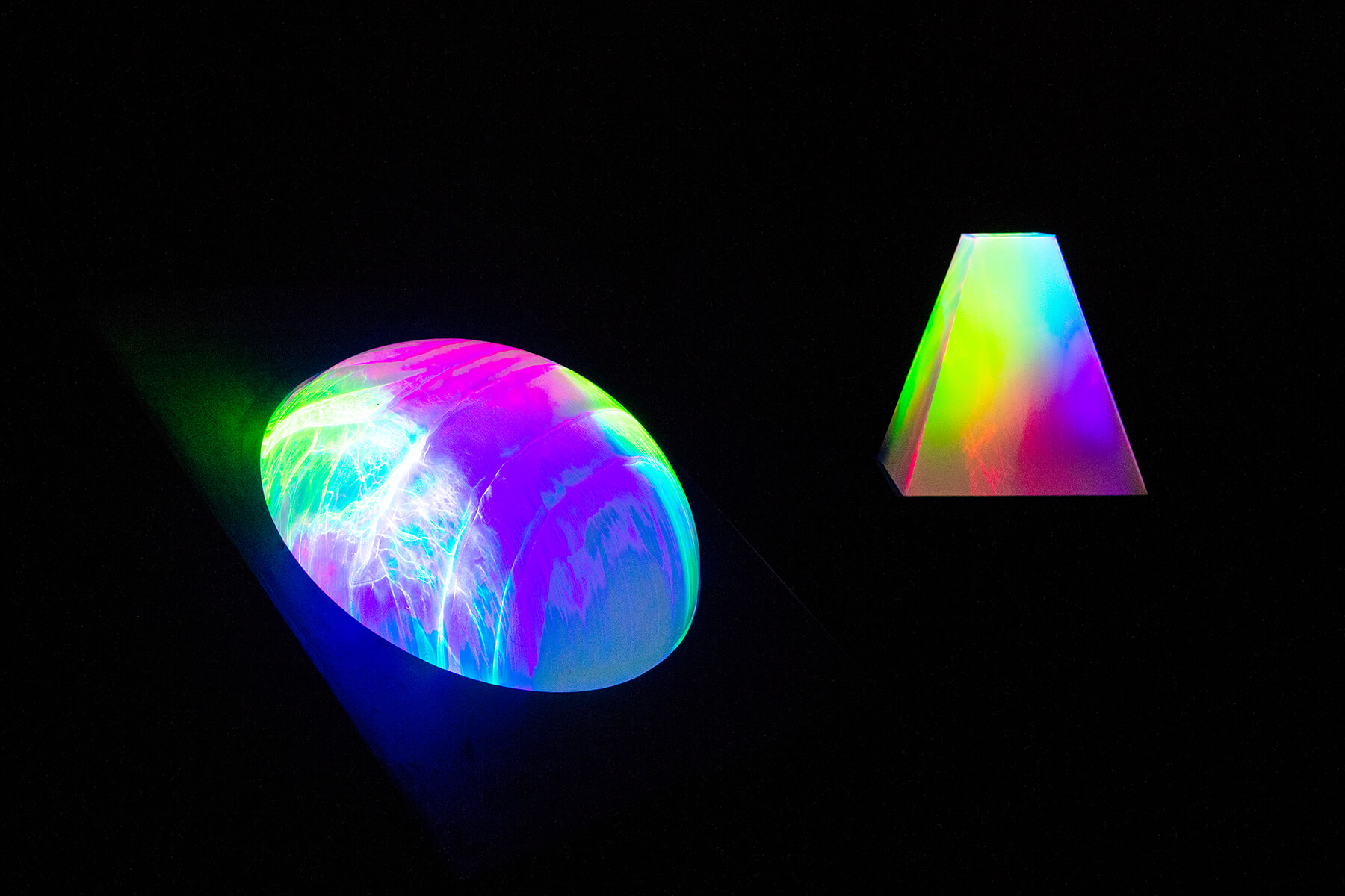 A nagyfokú rendezettséggel bíró és interferencia-képessége miatt médiumújító lehetőségeket rejtő, egyszerre monokromatikus és koherens fénysugár, a lézer grafikai eszközként hasznosul Csáji Attila kezében. Az itt bemutatott installáció a mérnöki-technicista gondolkodás intellektuális meghatározottságát és a művészet elvonatkoztatott nyelvén keresztül értelmezett világ költőiségét egyszerre jeleníti meg. Csáji művében a fény logikus és mágikus minőségének ambivalens kettőssége lép szintézisre egymással. A művész figyelme a heterogén elemek ötvözésére, két ellenpólus összebékítésére irányul. A mű dramaturgiája a geometriai testek statikus, a stabilitást hangsúlyozó, lezárt formája és a belőlük felszabadult, a spektrum színeire bontott, mozgó lézerfény képlékeny, puha és sejtelmes karakterében feszül. Csáji ihlető forrásai között találjuk Kállai Ernő A természet rejtett arca (1947) című könyvét, ami hitelt ad annak a meggyőződésének, hogy fellebbentse a fátylat a műszerek által feltárt világ rejtett struktúráiról és a művészet közvetítésével tegye láthatóvá és megtapasztalhatóvá a tudomány misztériumát. Az installáció címében a számok képzeletben utalnak azokra a személyes emlékekkel terhes összefüggésre, ami a holdra szállás műszaki-tudományos és kulturális jelentősége, a lézer szuperpozíciós formák megjelenítésére alkalmas technikájának szabadalma és az univerzumot alkotó alapformákként tekintett platonikus testek fénykinetikai felhasználása közötti dátumok között fennáll.