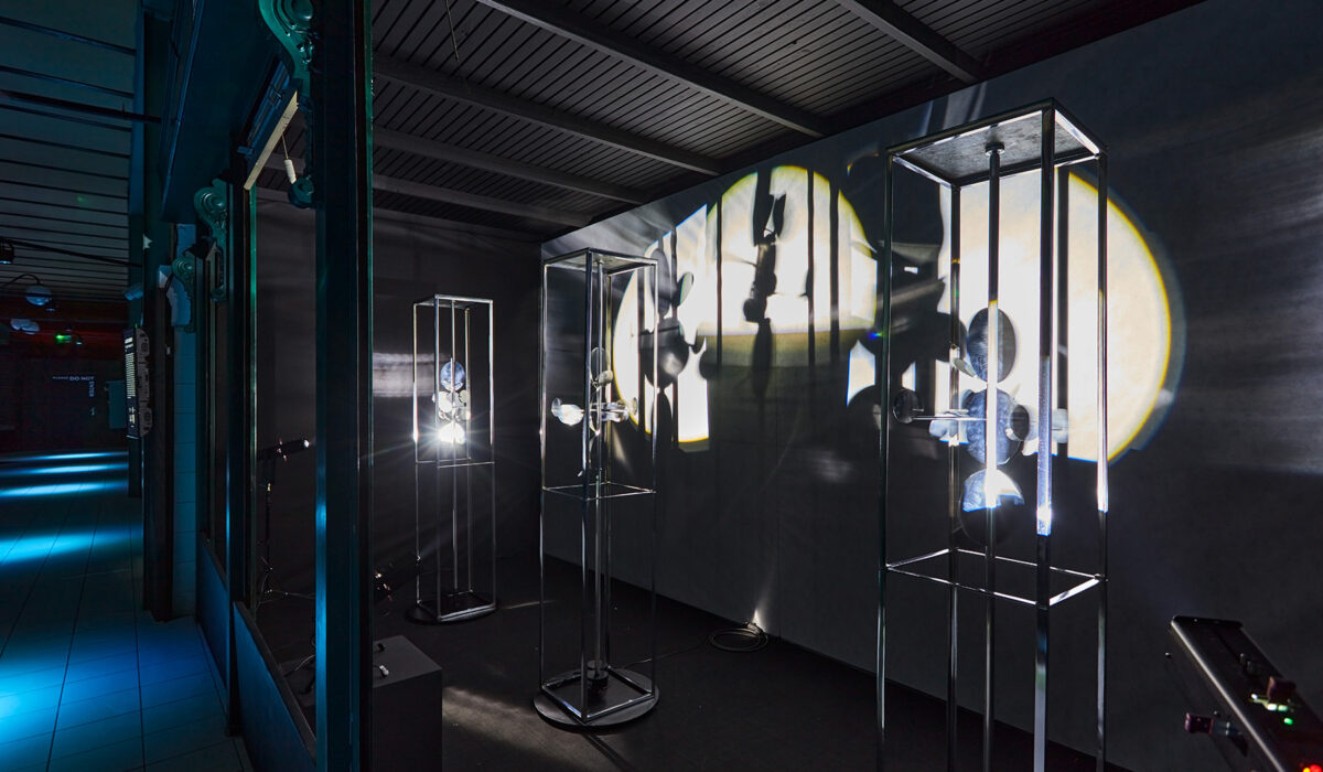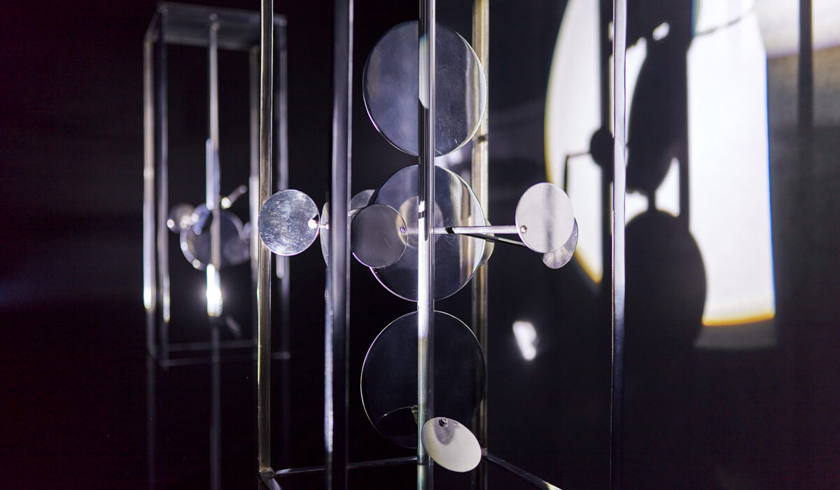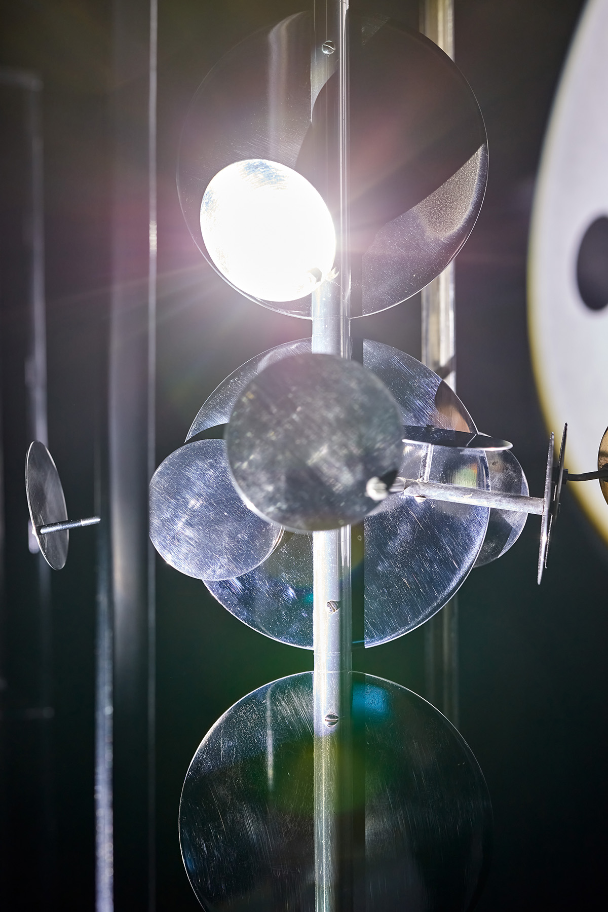 A három négyzet alapú hosszúkás hasáb nikkel vázon belül három-három, egymás fölötti nagyobb nikkel korong és több kisebb található, melyeket fény hatására elektromos motor forgat. A fénnyel megvilágított korongok luminokinetikus játékba kezdenek, speciális pályát írnak le egymás körül, villódzva tükrözik vissza a fényt és megvilágítják környezetüket. A valós, és virtuális mozgás révén az állandó változásban lévő konstrukcióknak az idő is alkotó elemévé válik. A szobor végül anyagi mivoltában a mozgás és a fény által feloldódik, elanyagtalanodik, a reflexfények pedig a térbe kiterjesztik.