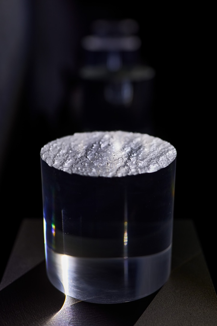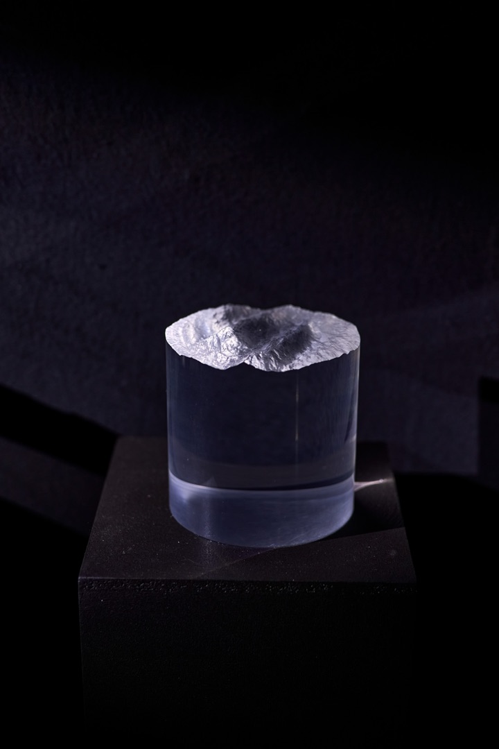 David Bowen szobrai a vízhullámok állandóan változó lüktetésének egy múló pillanatát örökítik meg, térben és időben megfagyasztva azt. A művész a víz dinamikus, fluid mozgását egy CNC-marógép segítségével statikus, háromdimenziós formává alakítja, paradox módon kimerevítve a természet szüntelen változását. A végtelen hullámmozgások egyetlen pillanatának digitális rögzítésével létrejött művek a tünékeny természeti jelenségek esszenciájának megragadására és művészi élménnyé transzformálásának lehetőségein való elmélkedésre késztethetik a nézőt. A szobor bonyolult, apró részletei és hullámzó felülete a víz erejének és a hullámmozgások összetettségének kézzelfogható lenyomataként szolgál, szembeállítva a mulandót az állandóval. A címben szereplő pontos földrajzi koordináták az észak-amerikai Felső-tóra utalnak, és egy konkrét helyhez társítják ezeket a megfagyott hullámokat, tovább hangsúlyozva a vízmozgások univerzális természete, valamint a térben és időben kiragadott pillanat különlegessége közötti feszültséget. A szobrok a művész tágabb értelemben vett művészi gyakorlatát példázzák, amely egyedülálló perspektívákat kínál a természet, a technológia és az emberi érzékelés közötti kapcsolatra.
