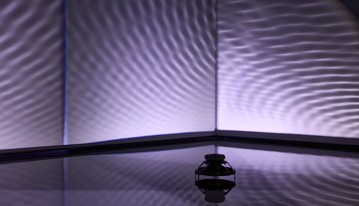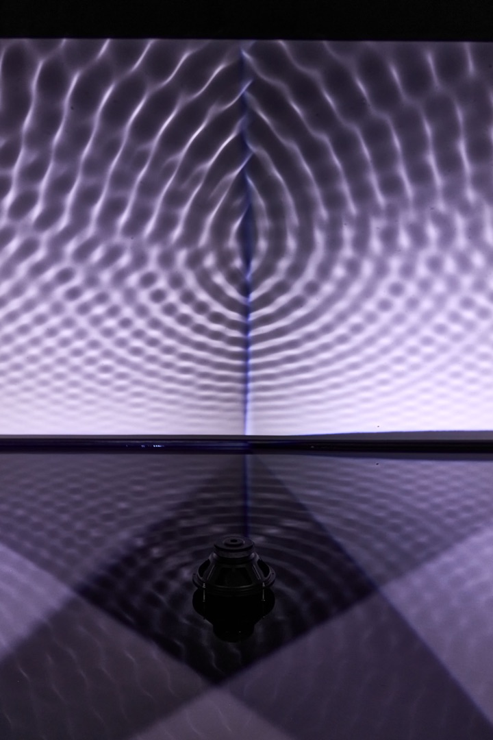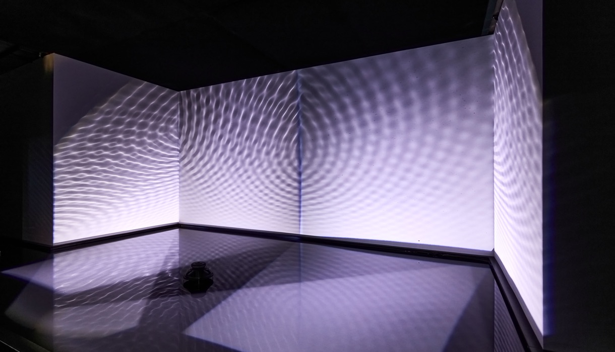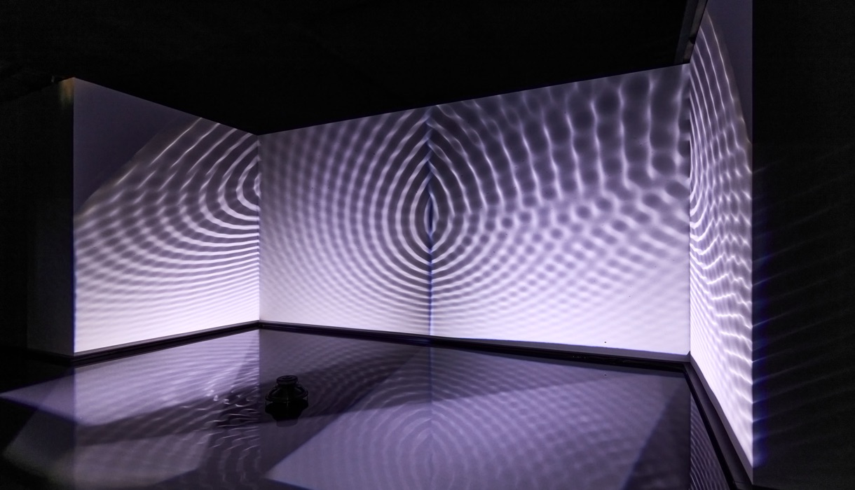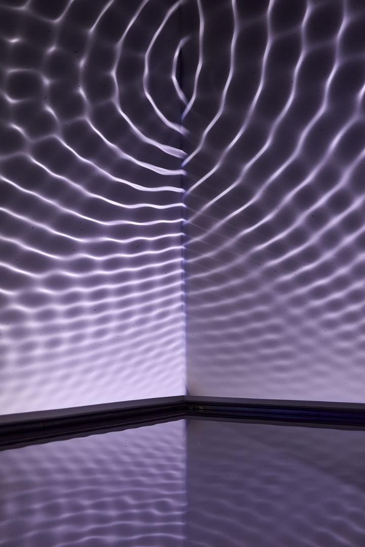 Finnbogi Pétursson izlandi képzőművész installációja egy különös hangulatú, meditatív teret hoz létre. A tér nagy részét elfoglaló sekély medencében három hangszóró található, melyek ismétlődően 3 hertzes hangot bocsátanak ki. A hanghullámok által megrezegtetett vízfelület koncentrikus körökben hullámozni kezd. A vízfelületet megvilágító fények árnyéka a falra vetül, az egymást metsző vízhullámok fluid gomolygása betölti a teret.