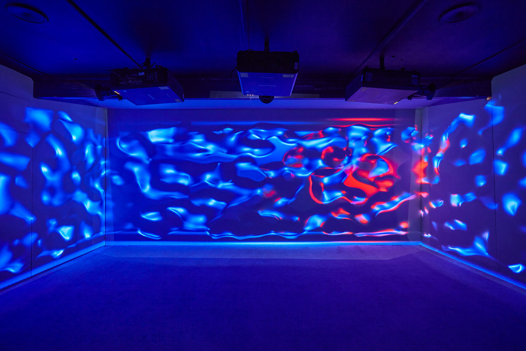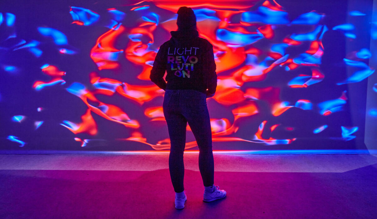 A mű varázslatos terében a fény túllép hagyományos, statikus szerepén: az élet és az energia megtestesítőjévé válik. Az ún. biofoton-teória által inspirált alkotás már-már spirituális élményt nyújt, arra biztatja a nézőt, hogy elmerengjen a világgal való kapcsolatán. A biofoton-elmélet alapján az élő szervezetek sejtszinten fényenergiát bocsátanak ki és nyelnek el, ez a jelenség pedig döntő szerepet játszik olyan biológiai folyamatokban, mint a sejtek közötti kommunikáció vagy a DNS-replikáció. A Phōs „alvó”, nyugalmi állapotában azúr színű fény borítja be a szenzorokkal felépített installációt. A néző belépése, mozgása, akár a legkisebb mozdulatai szignifikáns változást idéznek elő, fokozatosan a vörös fény különböző árnyalataival telik meg a tér, és az emberi energia által hullámzó, dinamikus formák meditatív fényjátéka bontakozik ki a határolófalakon. Az élénkvörös szín, a lüktetés a humán beavatkozás, az emberi kapcsolat melegséget, elevenséget teremtő erejére utal. (R. G. | M. Sz.)