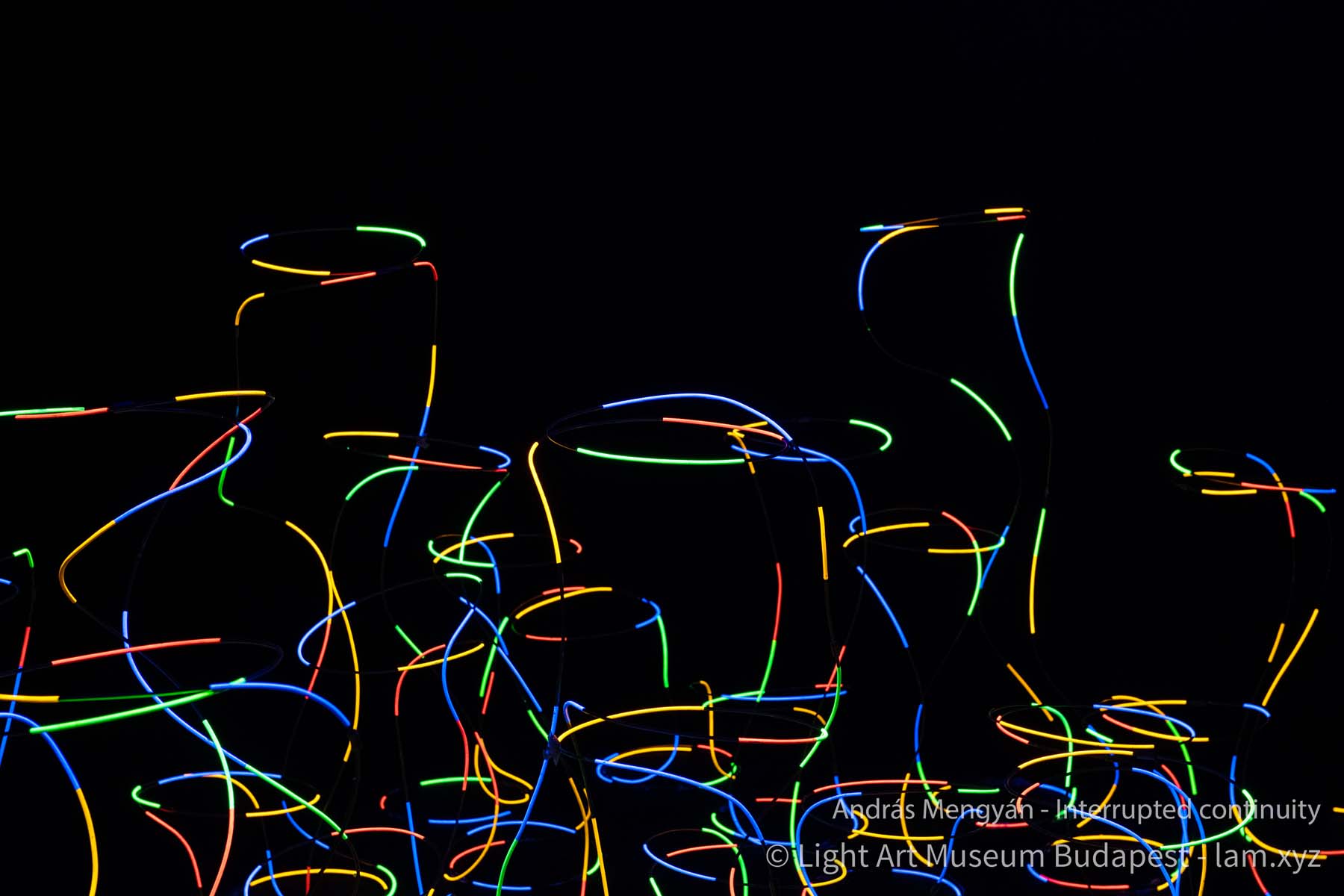 A fényinstalláció egy kígyószerűen tekeredő, folyamatos vonalstruktúrát rajzol ki a térben, ami az éppen aktuális nézőpontnak megfelelően egy új arcát tárja fel a nézőnek. A hajlított sárgaréz drótháló egyes részeit, megszakításokkal, különböző színű fluoreszcens festékkel vonta be a művész, ami által a szövevényes vonalhálóból létrehozott térbeli alakzatok befejezetlennek és képzeletbelinek tűnnek, mintha a látható és a láthatatlan világ küszöbét jelölnék. A mű kiindulópontját Mengyán egy rendőrségi fogházban tett látogatása adta. Az installáció ugyanis egy olyan helyen lett először bemutatva a norvégiai Oslóban, ami korábban az ott fogva tartott rabok cellájaként szolgált. A művész helyspecifikus alkotása ebből adódóan a börtönlakók megváltozott életkörülményeire is reflektál. Az egyszerre folyamatosnak és megtörtnek látszó fény egyúttal az ő életükben történt drámai változást szimbolizálja.