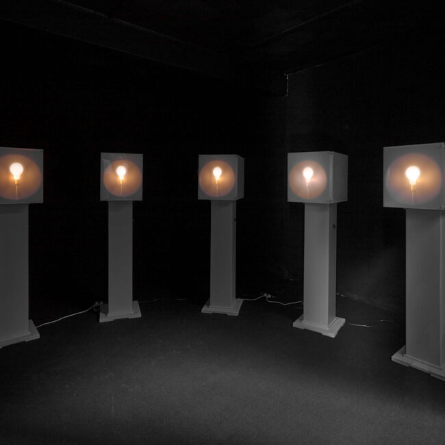 Camera obscura installáció, villanykörte, MDF, változó méret