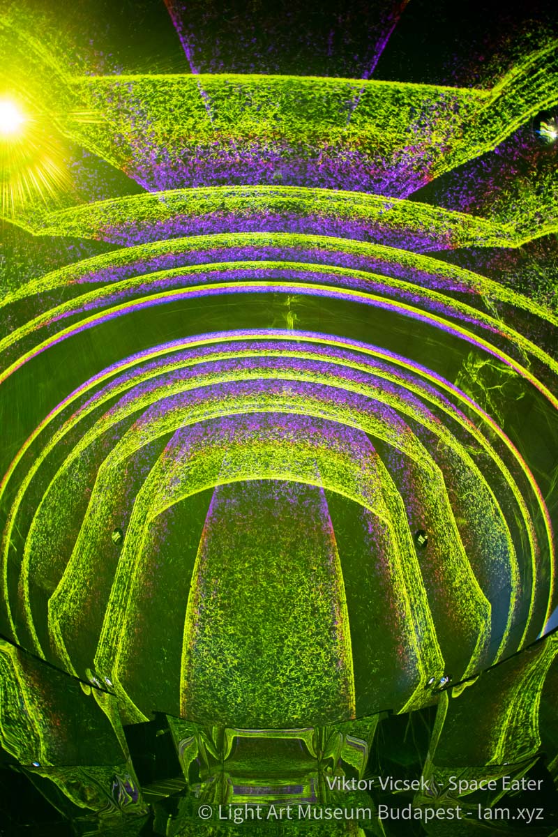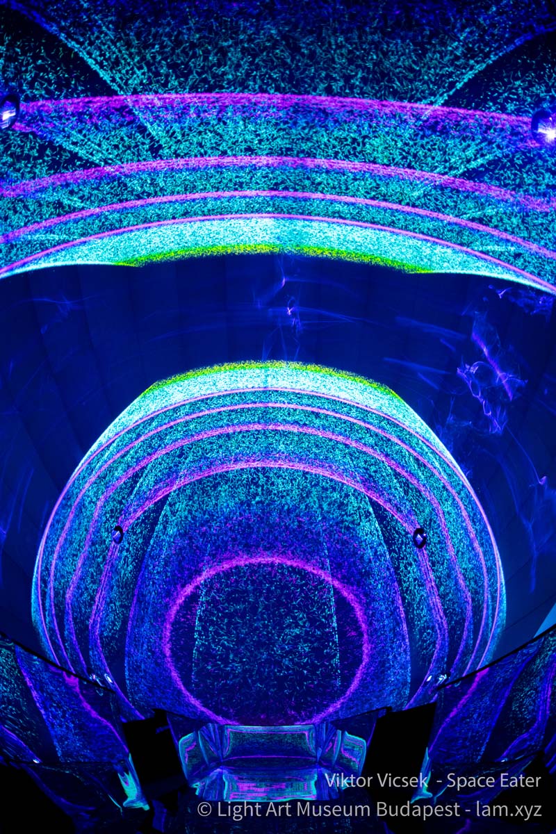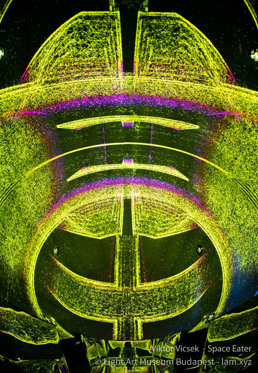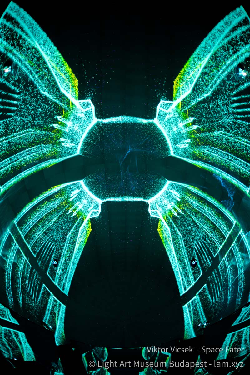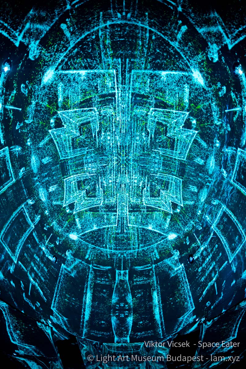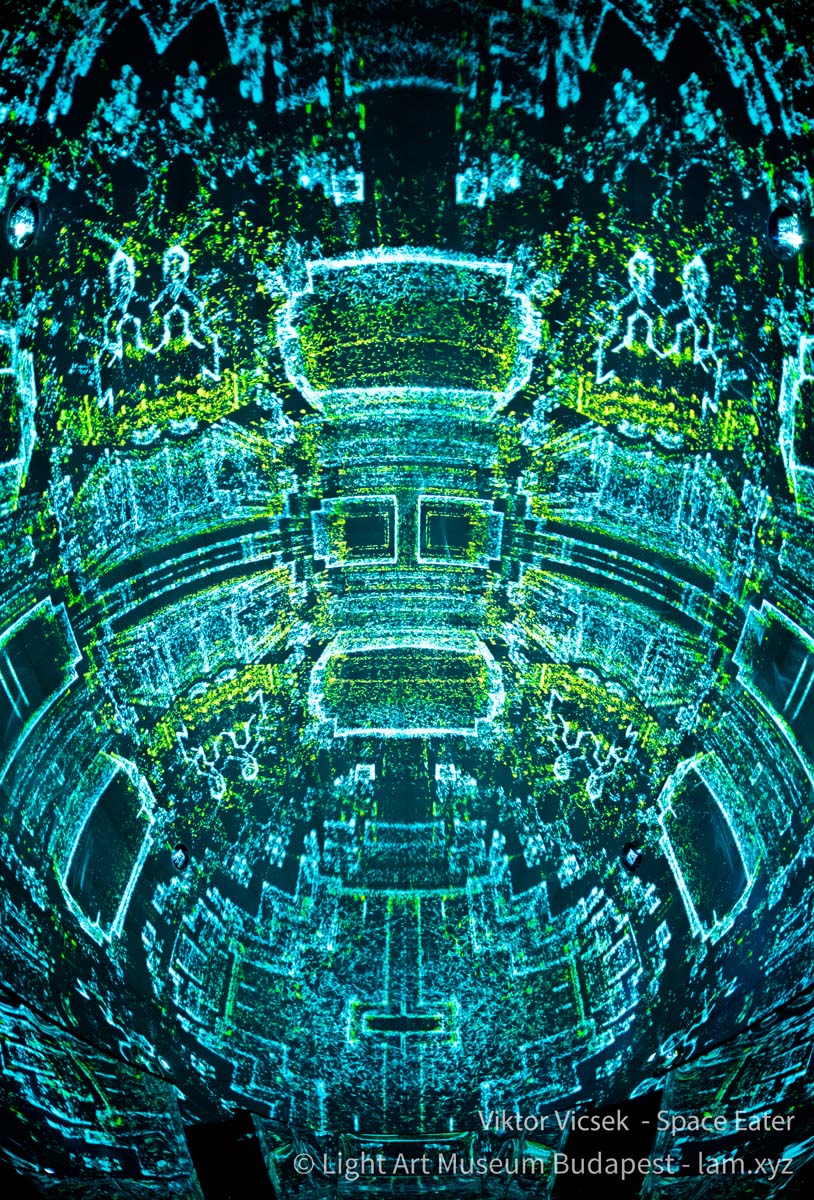 Vicsek Viktor generatív módon működő audiovizuális vetítése a kinetikus építészet lezáratlanságát, szabadon alakítható jellegét a fény anyatlanságának a koncepciójával kapcsolja össze. A tükröződés, a virtuális tömegképzés és a szimmetria segítségével olyan fiktív, állandó átalakulásban lévő tereket mutat meg, amelynek pontszerű elemekből összeállított struktúrái a látvány testies jelenlétét dramatizáló barokk kori mennyezetfreskók sotto in sù és quadratura technikáinak az illuzionizmusát fordítják át egy 21. századi médiumba.