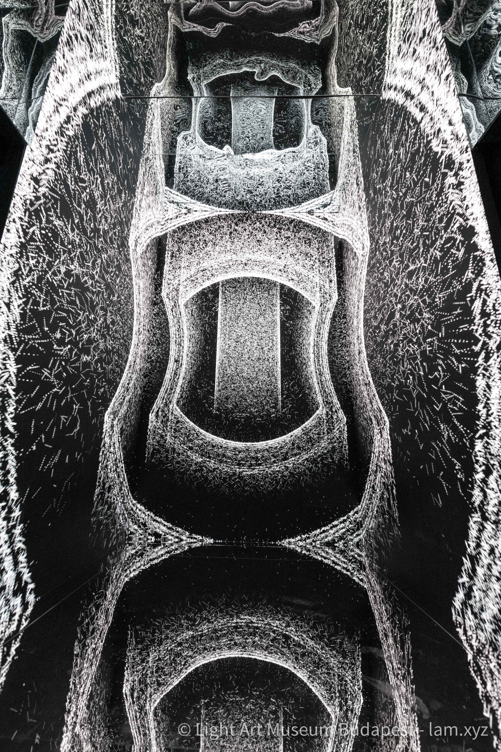 Vicsek Viktor generatív módon működő audiovizuális vetítése a kinetikus építészet lezáratlanságát, szabadon alakítható jellegét a fény anyatlanságának a koncepciójával kapcsolja össze. A tükröződés, a virtuális tömegképzés és a szimmetria segítségével olyan fiktív, állandó átalakulásban lévő tereket mutat meg, amelynek pontszerű elemekből összeállított struktúrái a látvány testies jelenlétét dramatizáló barokk kori mennyezetfreskók sotto in sù és quadratura technikáinak az illuzionizmusát fordítják át egy 21. századi médiumba.